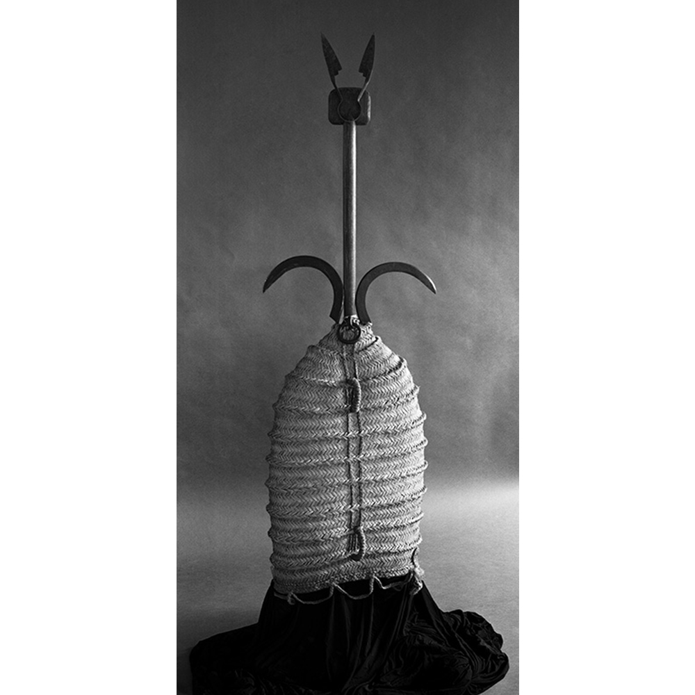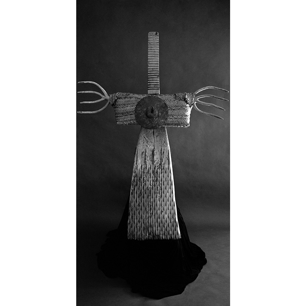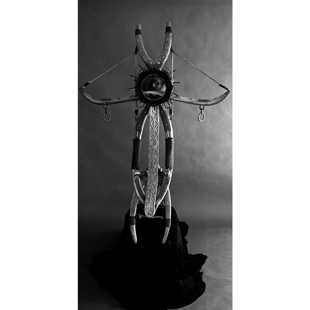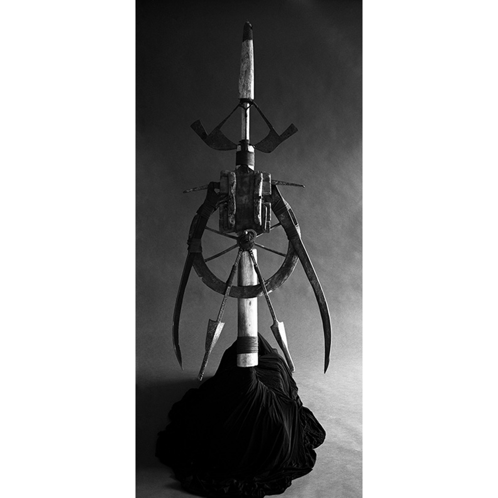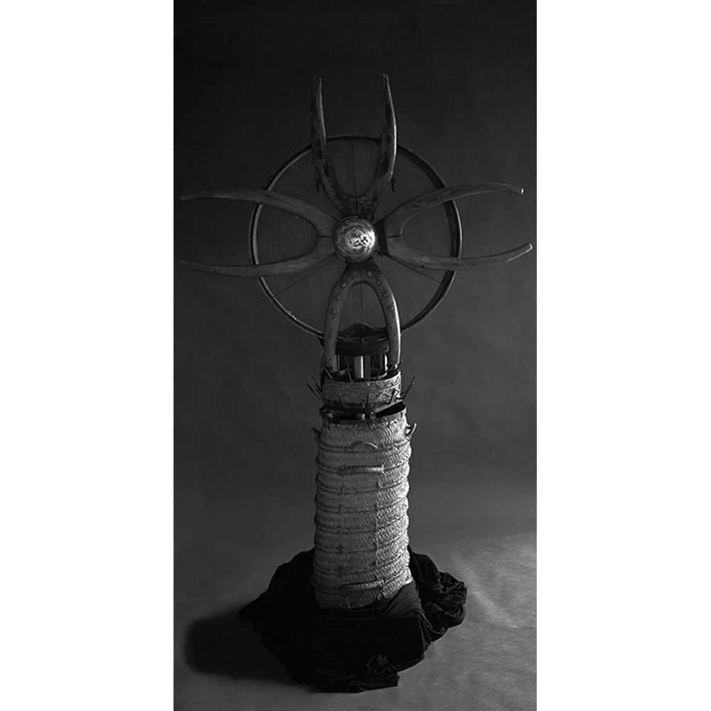 The totems themselves are built by hand, from antique agricultural tools — rusted blades, wooden handles, and fragments of forgotten labor. These materials carry the memory of the land, the rhythm of human survival, and the physical trace of instinct. They transform work into worship, function into myth.